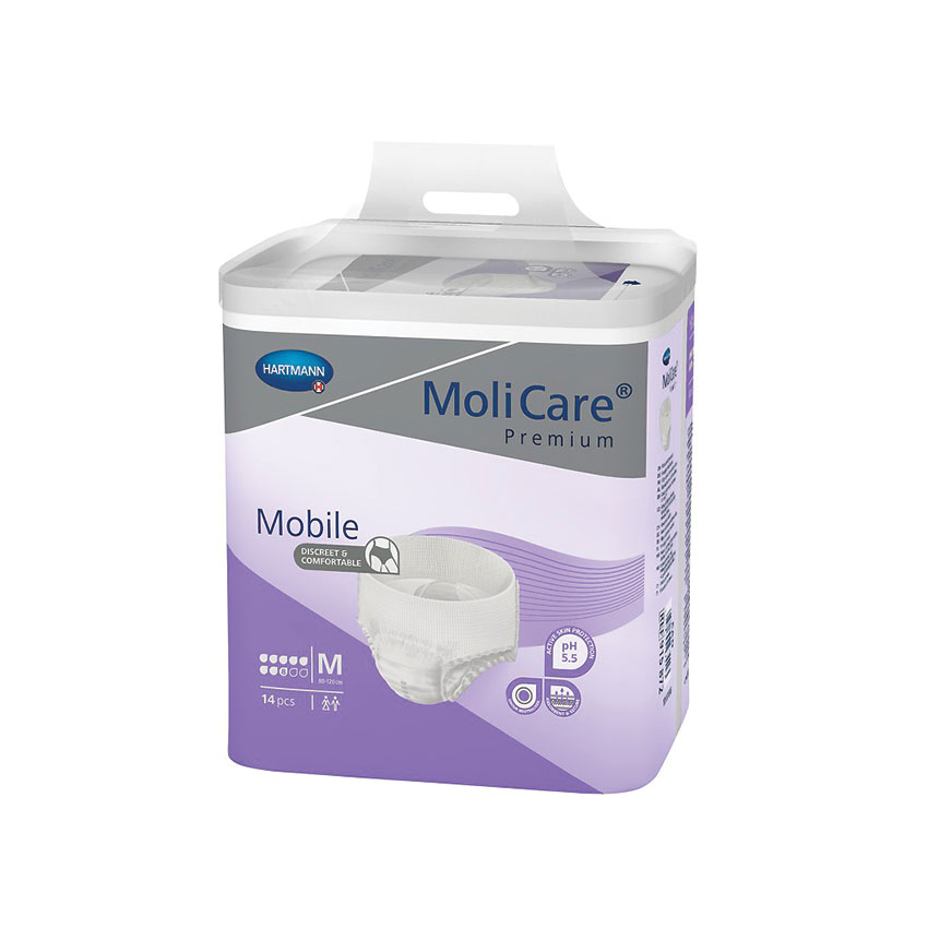 MoliCare Mobile pull up pants look and feel like normal underwear and offer the highest level of leakage protection. Its three way protection system gives MoliCare Mobile extra-strong leakage protection. The unique DryPlus non-woven layer locks liquid away rapidly to keep the skin comfortably dry.